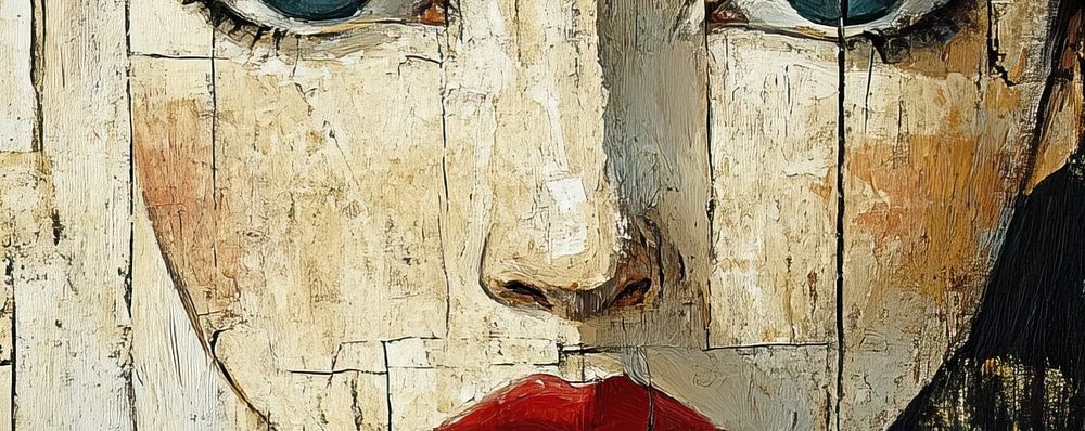 Frauengesicht | Blickintensität - Dieses Frauenbild zeigt ein ausdrucksstarkes Porträt einer Frau mit intensiven blauen Augen und auffallend roten Lippen, ausgeführt in einem abstrakten, fast collageartigen Malstil mit einem Hintergrund aus Natur- und Beigetönen.