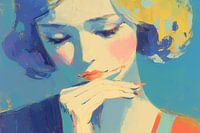 Frauenporträt | Stille Muse - Dieses Frauenbild zeigt eine introspektive Dame mit niedergeschlagenen Augen, die ihre Finger elegant an ihr Kinn legt. Der Stil ist modern und impressionistisch, mit lebhaften Pinselstrichen in Blau, Gelb und Rosa.