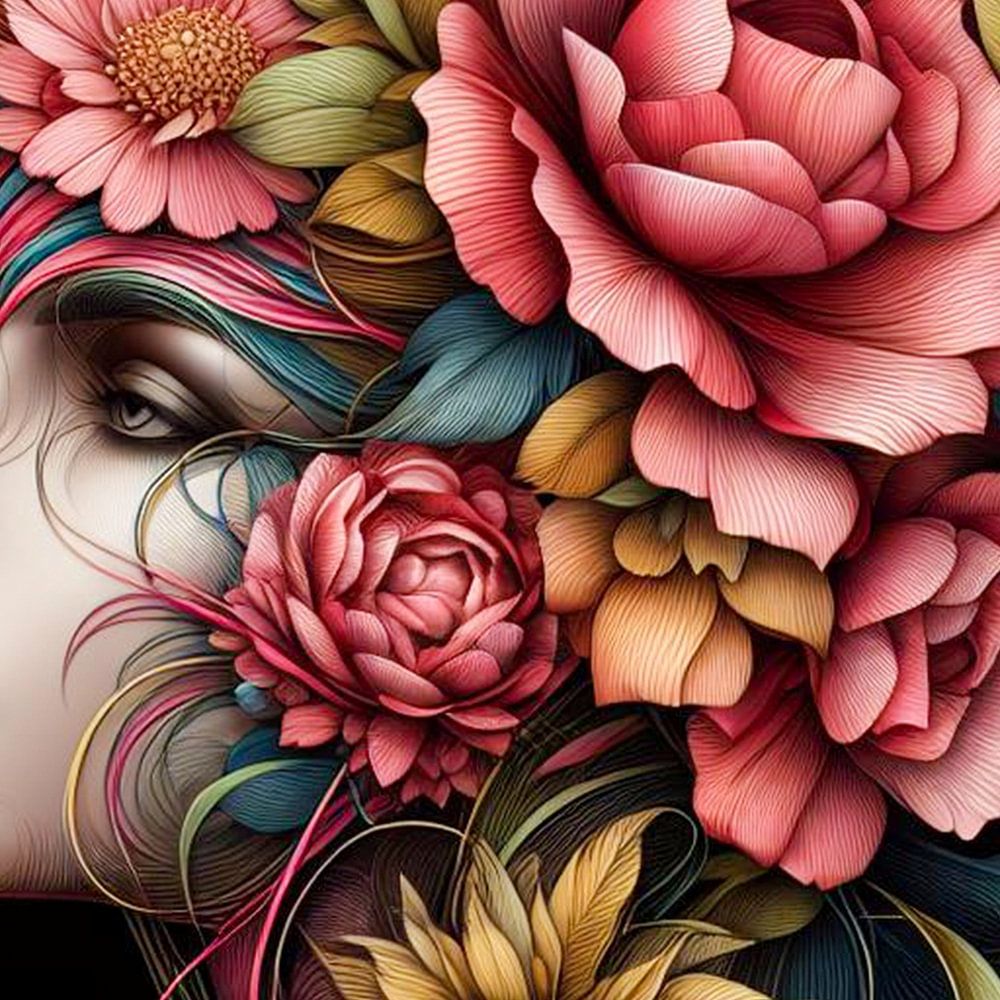 Frauenporträt mit bunten Blumen im Haar, Blumenfrisur abstrakt