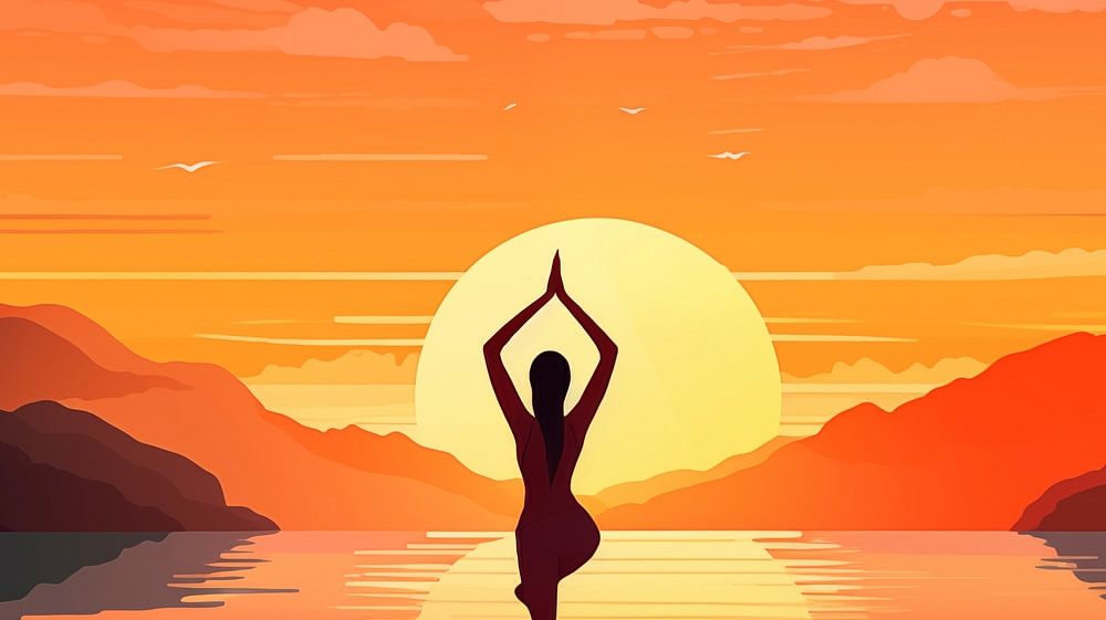 Frauensilhouette macht Yoga am Strand bei Sonnenuntergang