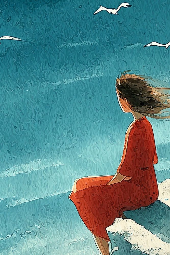 Ein poetisches Bild einer Frau in einem roten Kleid, die auf einem Felsvorsprung mit Blick auf das türkisfarbene Meer sitzt. Der Wind spielt mit ihrem Haar, während weiße Möwen frei durch die Luft schweben. Die minimalistische Farbgebung und die verträumte Atmosphäre erzeugen ein Gefühl von Freiheit und Kontemplation.