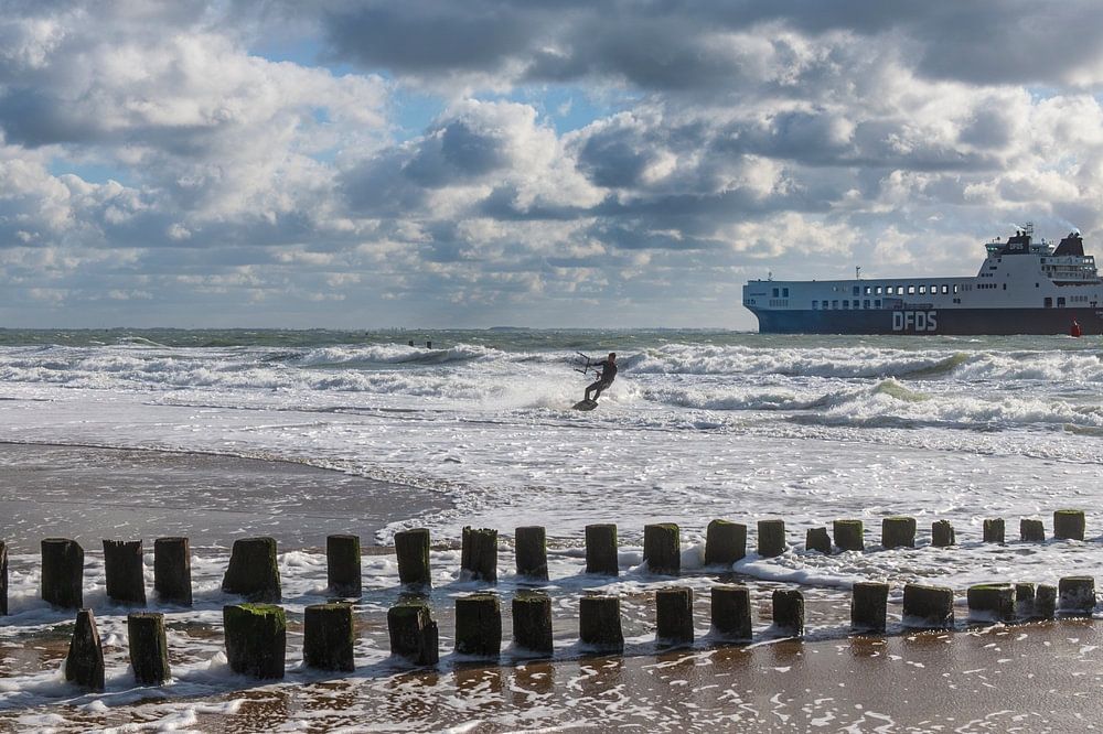 An der Küste von Groot Valkenisse werden Wind und Wasser lebendig. Ein Kitesurfer tanzt auf den Wellen, getragen von der Kraft des Windes.
