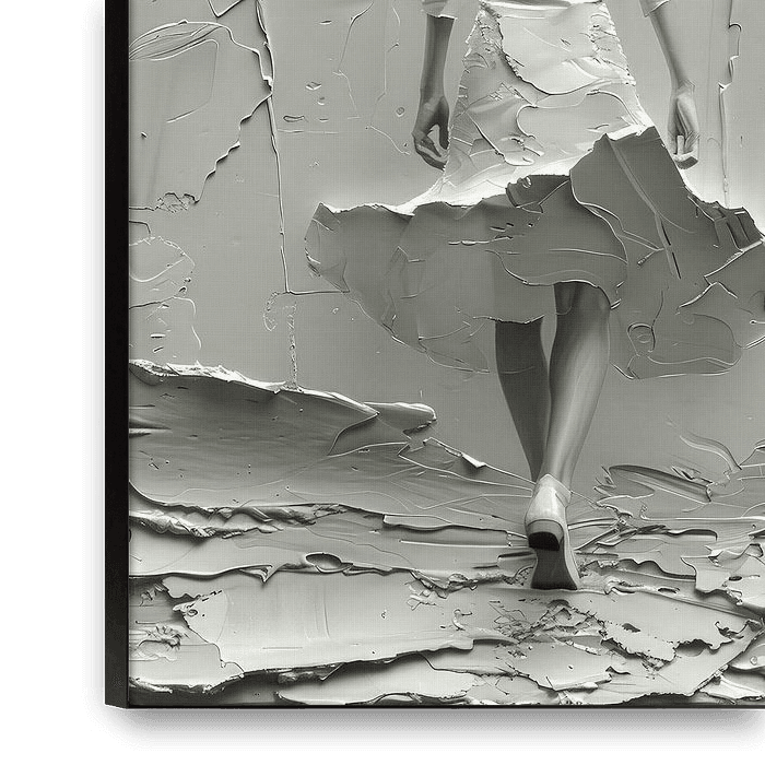 Dieses ausdrucksstarke Kunstwerk ist eine lebhafte Darstellung von Bewegung und Textur. Es zeigt eine Frau, die in einem weißen Kleid spazieren geht, während ihr wildes, dunkles Haar im Wind weht.
