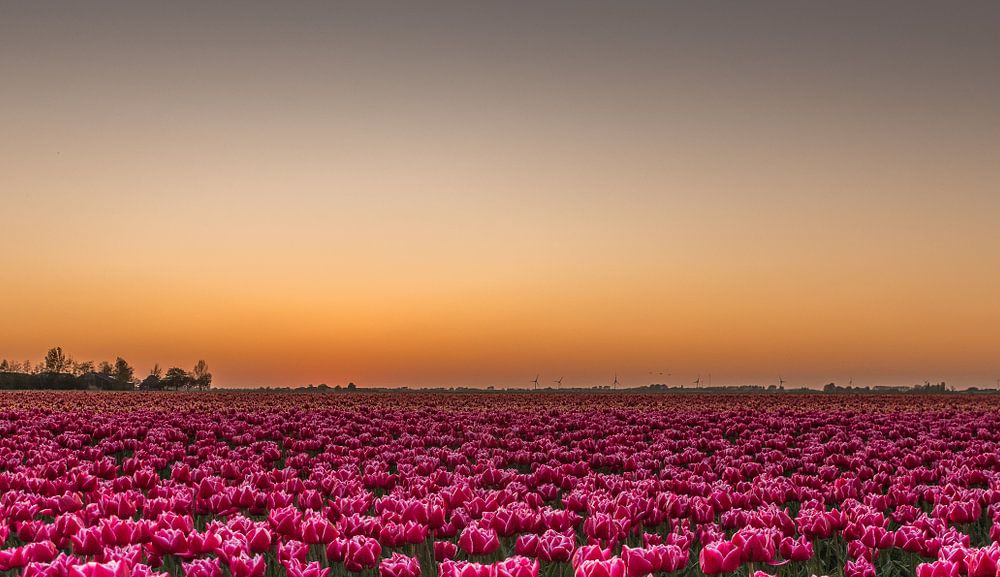 Ein schönes Bild eines Tulpenfeldes bei Sonnenuntergang und zu Beginn der "blue"Stunde! Schönes Licht auf die schönen Tulpen, die ein märchenhaftes Bild ergeben.