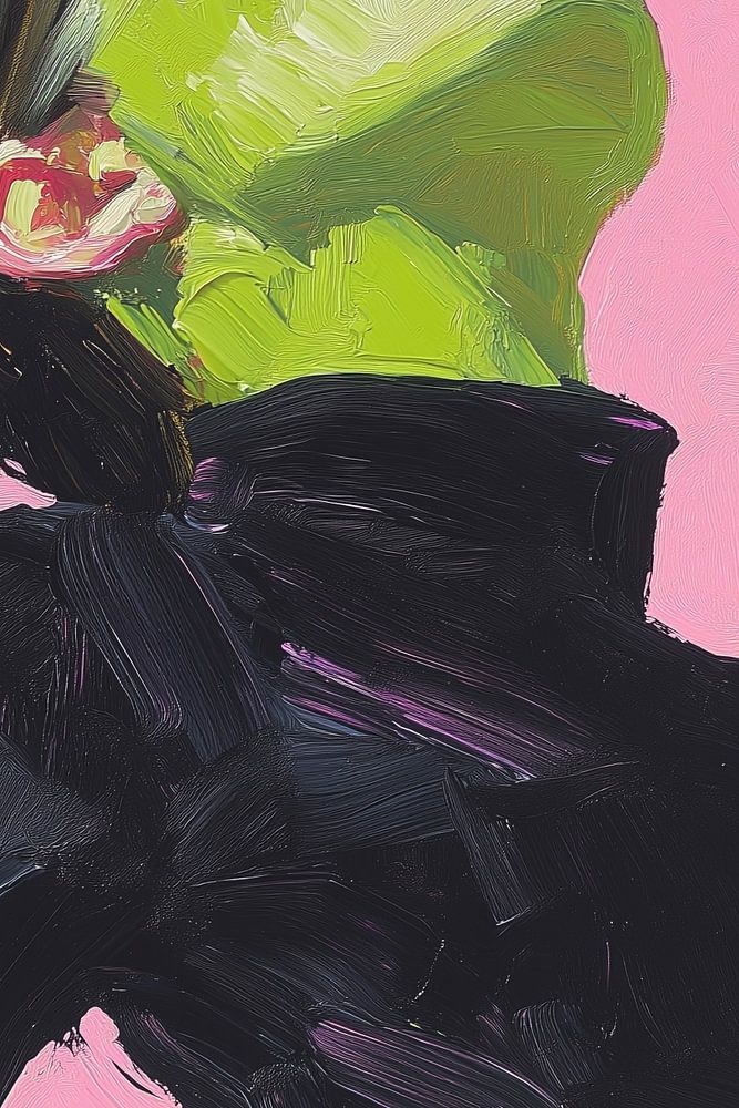 Das expressive und moderne Gemälde zeigt ein Frauenporträt, das sich durch kräftige Farbkontraste und dynamische Pinselstriche auszeichnet. Die Frau ist in einer kraftvollen Pose dargestellt, mit zurückgeworfenem Kopf und erhobenem Gesicht, die ein Gefühl von Selbstvertrauen und Freiheit ausstrahlt. Ihre Haut ist in leuchtendem Grün gemalt, das in direktem Kontrast zu dem rosa Hintergrund und der tiefschwarzen Kleidung steht. Dieser Einsatz von Farbe verleiht dem Werk ein surreales und kühnes Aussehen.