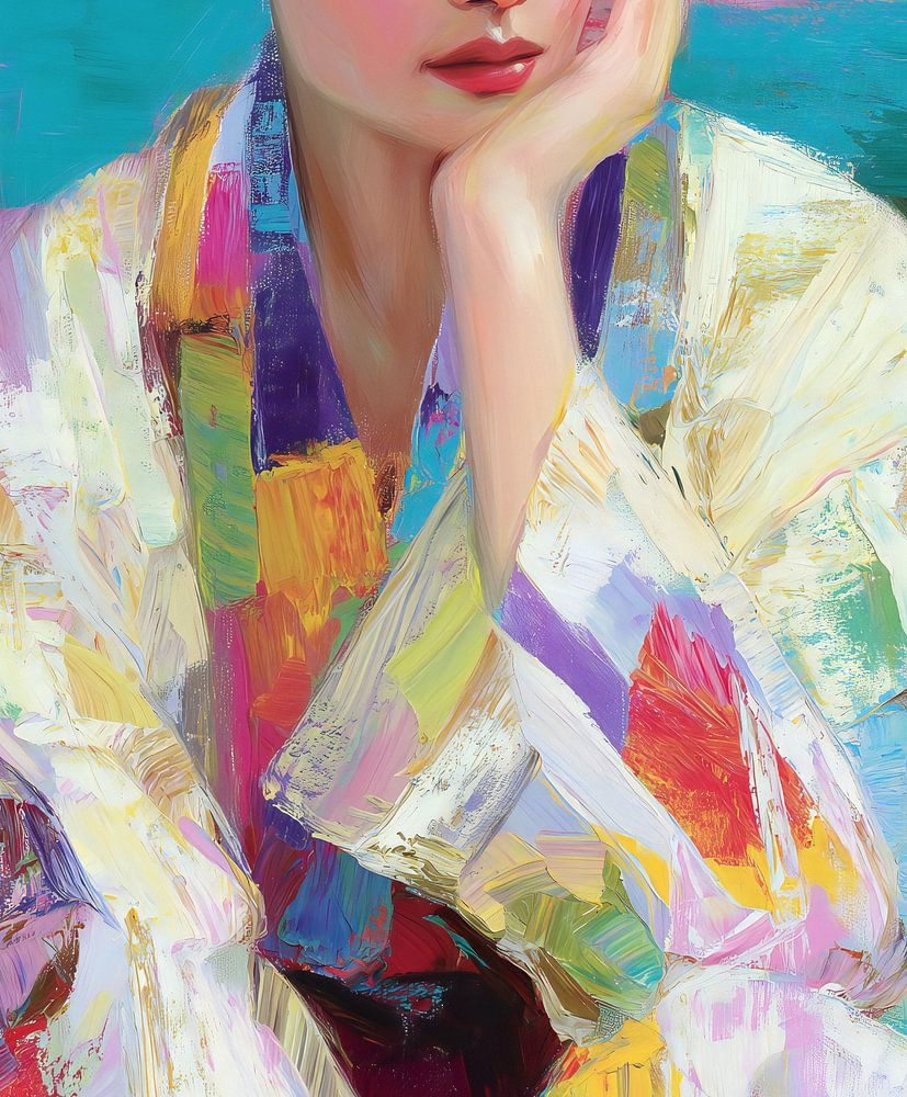 Abstraktes farbenfrohes Porträt einer heiteren Frau im Kimono.