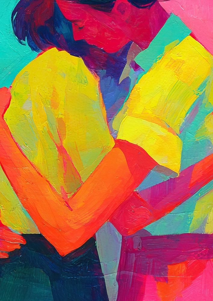 Embrace Joy - Dieses Gemälde zeigt eine innige Umarmung zwischen zwei Frauen mit einem lebhaften Hintergrund in verschiedenen hellen Farben, der ein Gefühl von Verbundenheit und Freude vermittelt.