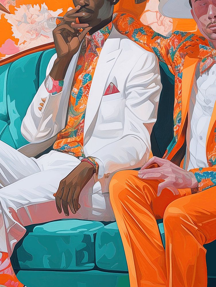 Dieses lebendige und ausdrucksstarke Kunstwerk strahlt eine einzigartige Mischung aus Stil, Eleganz und Entspannung aus. Zwei Freunde in exzentrischen und perfekt aufeinander abgestimmten Outfits nehmen auf einem luxuriösen türkisfarbenen Sofa Platz, umgeben von einer Explosion tropischer Blumen und warmer Orangetöne. Die Kontraste zwischen dem makellosen weißen Anzug und dem kühnen orangefarbenen Blumenensemble schaffen ein visuelles Spektakel, das Mode und Kunst miteinander verbindet.
