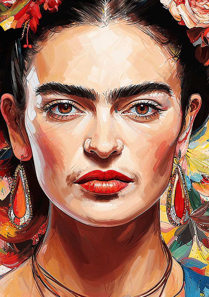 Frida Porträt, bunte, kräftige Farben, im Stil der Ölmalerei, Porträt von Frida mit Blumen im Haar, schönes und ausdrucksstarkes Gesicht, detaillierte Pinselstriche, weißer Hintergrund, helle Beleuchtung, weiche Schatten, emotionaler Expressionismus