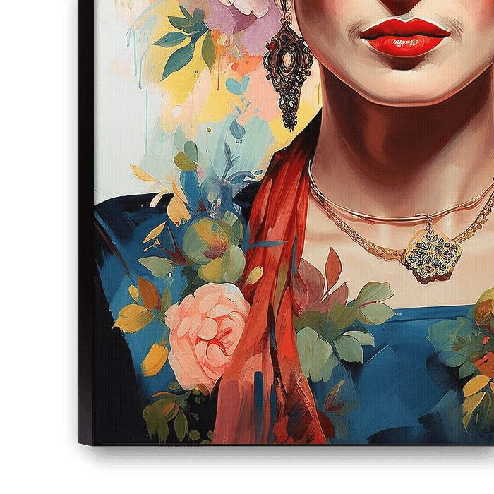 Frida Porträt, bunte Blumen in ihrem Haar und Kleid, ein schönes Gesicht mit roten Lippen, sehr detailliert mit perfekter Beleuchtung im Stil der filmischen Komposition Ölgemälde Stil hyper realistisch im Stil der Fotografie filmischen Farbabstufung -