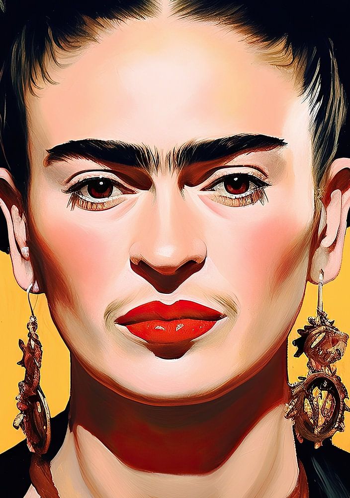 Porträt von Frida, ein schönes Gesicht mit Rosen im Haar, rote Lippen und Ohrringe an den Ohren, in einem schwarzen Kleid mit einem gelben Hintergrund, im Stil der Vektorkunst, warme Farben, Nahaufnahme, hohe Auflösung, hyper realistisches Porträt.