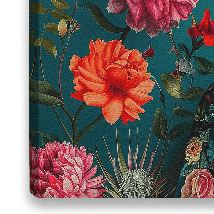 Ein lebhaftes und farbenfrohes Porträt von Frida, geschmückt mit komplizierten Blumenmustern auf ihrer Kleidung, vor einem üppigen Hintergrund voller blühender Blumen in verschiedenen Farben, Focus Stacking, Weitwinkelaufnahme.
