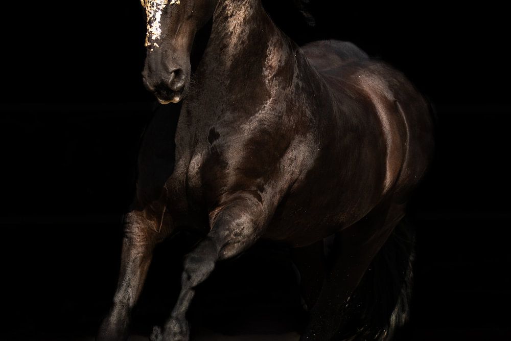 Schönes Friespferd im Galopp, dessen Kopf mit Blattgold verziert ist. Dies verleiht ein besonderes und luxuriöses Aussehen und steht in starkem Kontrast zum Schwarz des Hintergrunds und des Pferdes.