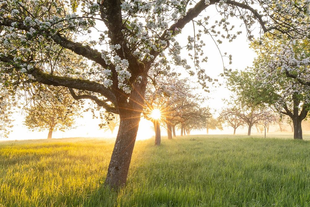 Im sanften Licht der aufgehenden Sonne erstrahlt die Apfelbaumallee in voller Frühlingspracht. Die zarten Blüten der Streuobstwiesen im Voralbgebiet öffnen sich dem neuen Tag entgegen, während ein feiner Bodennebel wie ein Schleier über den Wiesen liegt und der Landschaft eine fast märchenhafte Stimmung verleiht.