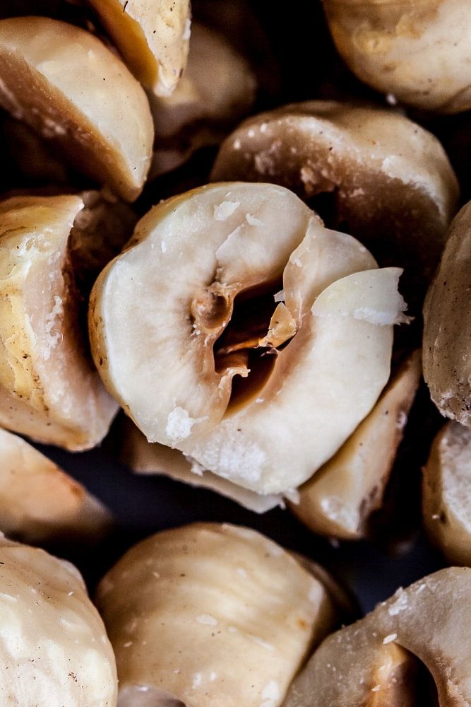 Frische, leicht geröstete Haselnüsse auf einem Marmorsockel.