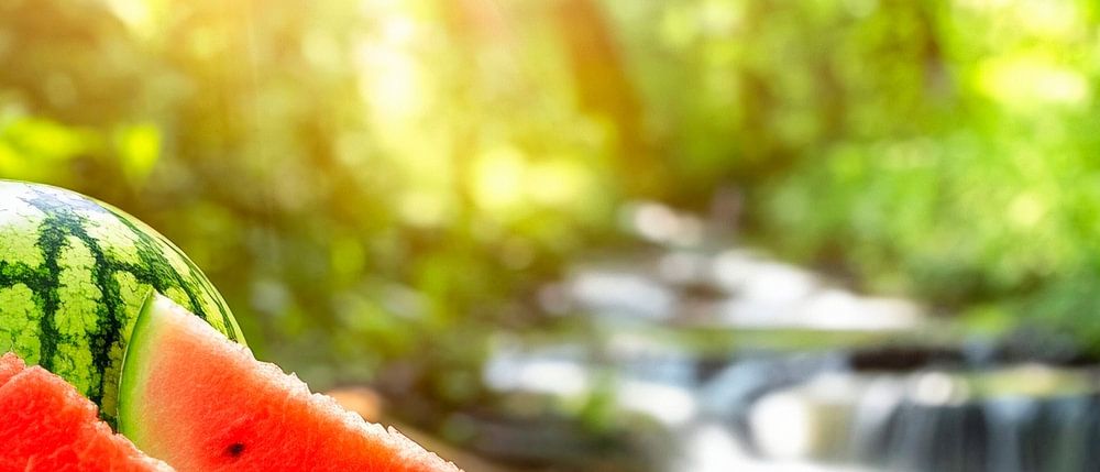 Saftige Wassermelonen harmonieren perfekt mit dem sanften Bluten der Natur, während die goldenen Sonnenstrahlen durch das Blätterdach scheinen. Der klare Wasserlauf im Hintergrund verstärkt das erfrischende Gefühl. Diese lebendige Komposition bringt ein sommerliches Flair in die Küche oder das Wohnzimmer, ideal für eine entspannte Atmosphäre voller Lebensfreude und Frische.