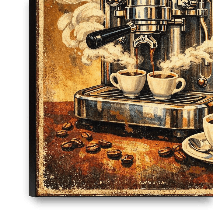 Ein Poster im Vintage-Stil, das eine klassische Kaffeemaschine zeigt, die frischen Espresso zubereitet, umgeben von aromatischem Dampf und Kaffeebohnen. Die perfekte Wanddekoration für Kaffeeliebhaber, Cafés, Küchen und Barista-Räume mit einer warmen Retro-Café-Ästhetik.