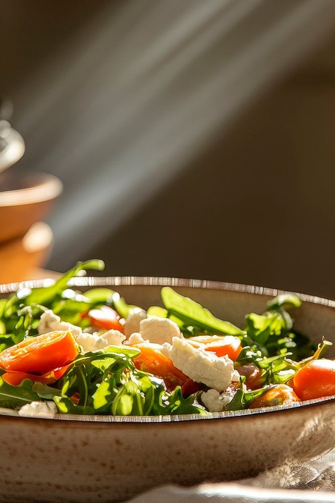 Leckere Frische und warmes Licht verschmelzen in dieser einladenden Bowl, gefüllt mit knackigem Grün und rot leuchtenden Tomaten. Die sanften Schatten und das natürliche Licht schaffen eine Atmosphäre der Gemütlichkeit, perfekt für eine moderne Küche, in der kulinarische Kreationen und gesellige Momente im Vordergrund stehen.
