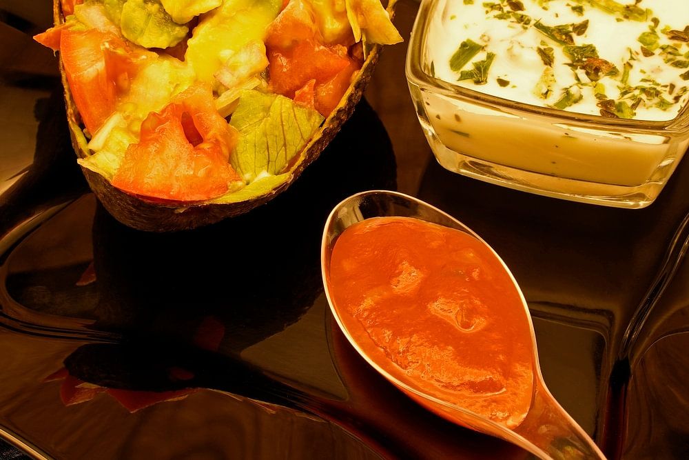 Frischer Salat in Avocadoschalen auf schwarzem Teller serviert