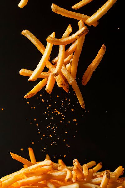 Bestelle das Foto Frittierte Pommes in der Luft – Kross und Lecker von Poster Art Shop als Reproduktion auf Leinwand, Alu-Dibond, als Poster, Fototapete oder Acrylglasbild.