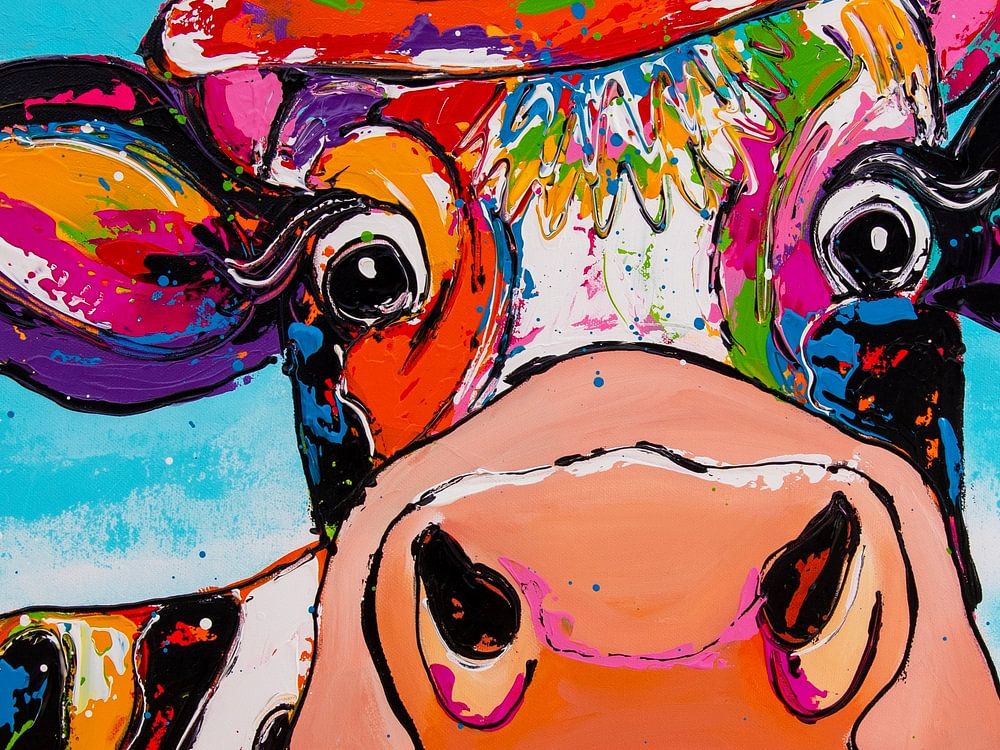 Entdecken Sie "Daisy's day out", ein farbenfrohes Gemälde mit einer glücklichen, lächelnden Kuh, die einen charmanten Hut aufgesetzt hat. Dieses Kunstwerk verkörpert Launenhaftigkeit und Freude und ist damit eine reizvolle Ergänzung für jede Sammlung.