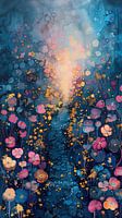 Fröhliche Blumen | Blumenweg - Dieses Blumenbild zeigt einen farbenfrohen Weg, der von fröhlichen Blumen in verschiedenen Schattierungen umgeben ist, wobei funkelnde Goldelemente die Beleuchtung akzentuieren.