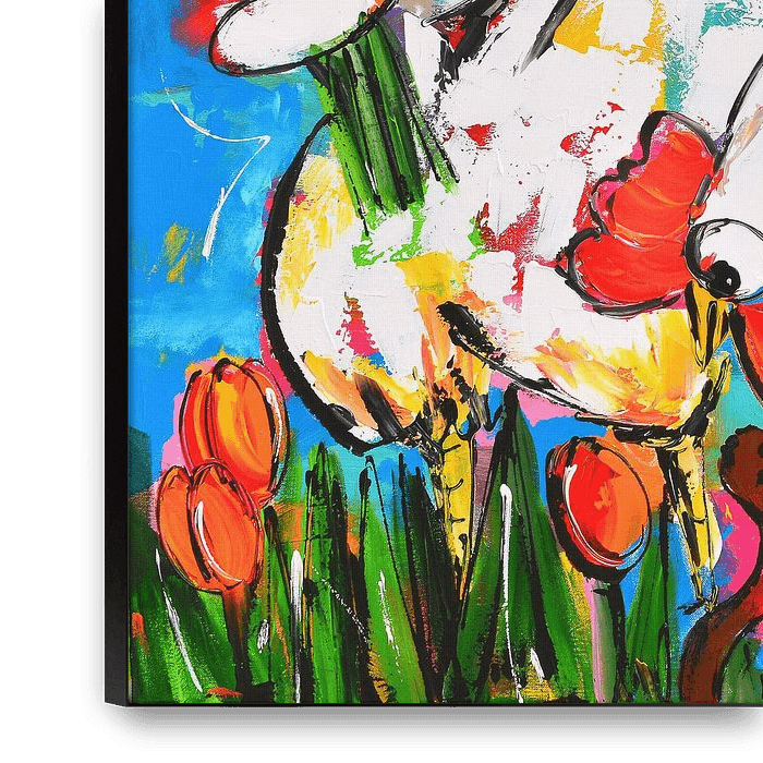 Bestelle dieses Blumen-Wandbild Fröhliche Hühner mit Tulpen von Vrolijk Schilderij als Reproduktion auf Leinwand, Alu-Dibond, als Poster, Fototapete oder Acrylglasbild.