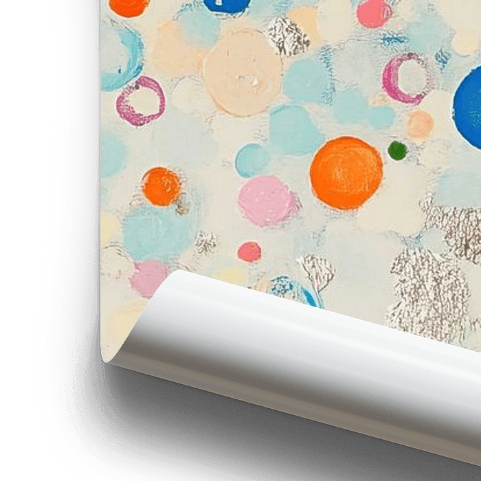 Merry Dots - Dieses farbenfrohe Frauenbild zeigt ein Mädchen mit geschlossenen Augen und einem heiteren Lächeln, umgeben von einem Meer aus lebhaften, abstrakten Kreisen und Punkten, die ihr Haar und ihre Kleidung zu formen scheinen, in verschiedenen Blau-, Orange-, Gelb- und Grüntönen.