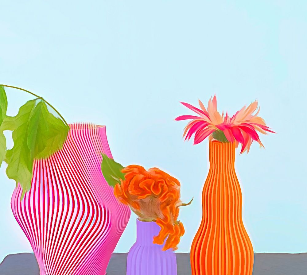 Fröhliche Impression mit bunten künstlerischen Vasen und Blumen.