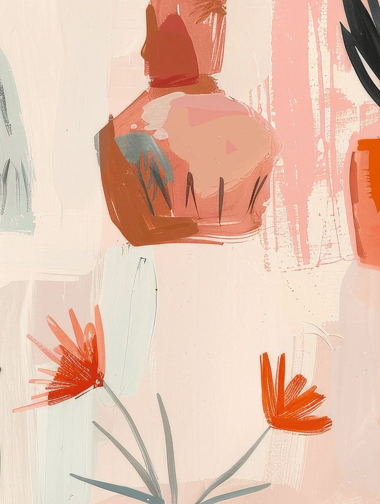 Heiteres botanisches Stillleben, Illustration. Terrakotta, böhmischer Stil. Wählen Sie die Größe und das Material für dieses moderne Werk und machen Sie es zu einem echten Blickfang für Ihr Interieur. Vollkommen zeitgemäß!