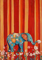 Fröhlicher Elefant mit Blumen – Auf diesem Tiergemälde sehen Sie einen fröhlichen Elefanten in lebhaften Farben, umgeben von Blumen und starken vertikalen Streifen im Hintergrund, was eine verspielte und entspannte Atmosphäre schafft.
