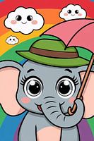 Dieses fröhliche Motiv eines niedlichen Elefanten mit einem grünen Hut und einem rosa Regenschirm ist perfekt für jeden Raum, der einen verspielten und farbenfrohen Look gebrauchen kann. Die großen, leuchtenden Augen des Elefanten strahlen Wärme und Freundlichkeit aus, während die lächelnden Wolken und der leuchtende Regenbogen im…