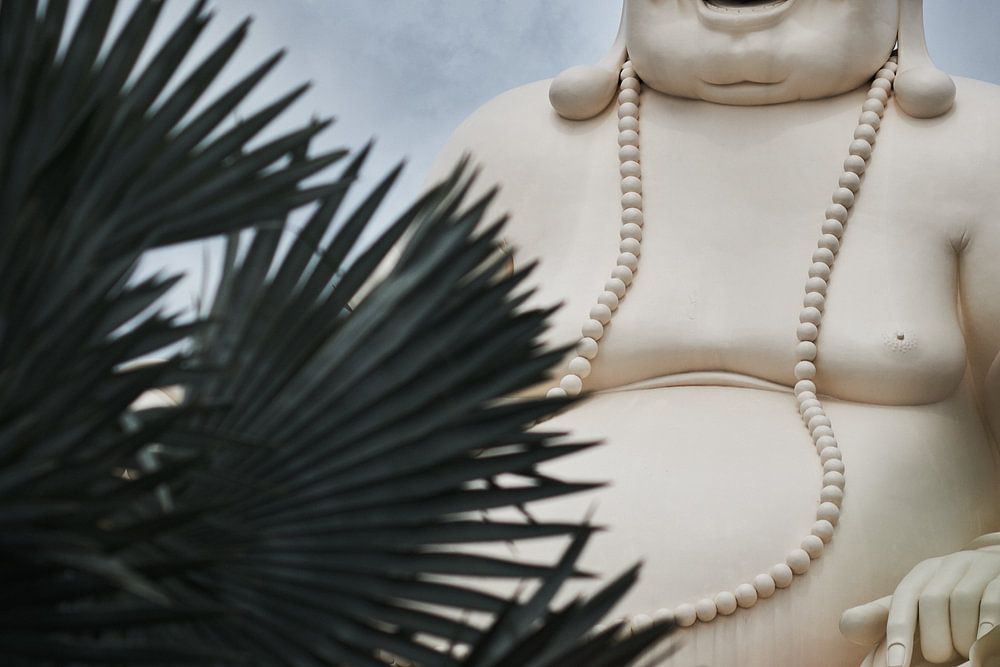 Fröhlicher Riesenbuddha in Vietnam. Bedrohlicher Himmel mit riesiger Buddha-Statue