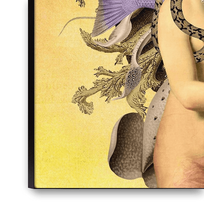Eine surrealistische Collage aus Vintage-Bildern zum Thema Meeresleben und Mythologie. Porträt eines nackten weiblichen Torsos, verziert mit verschiedenen lebensechten maritimen Elementen, darunter ein lila Fisch, Tintenfischarme, eine spiralförmige Muschel als Kopfbedeckung und eine Schlange um den Hals.