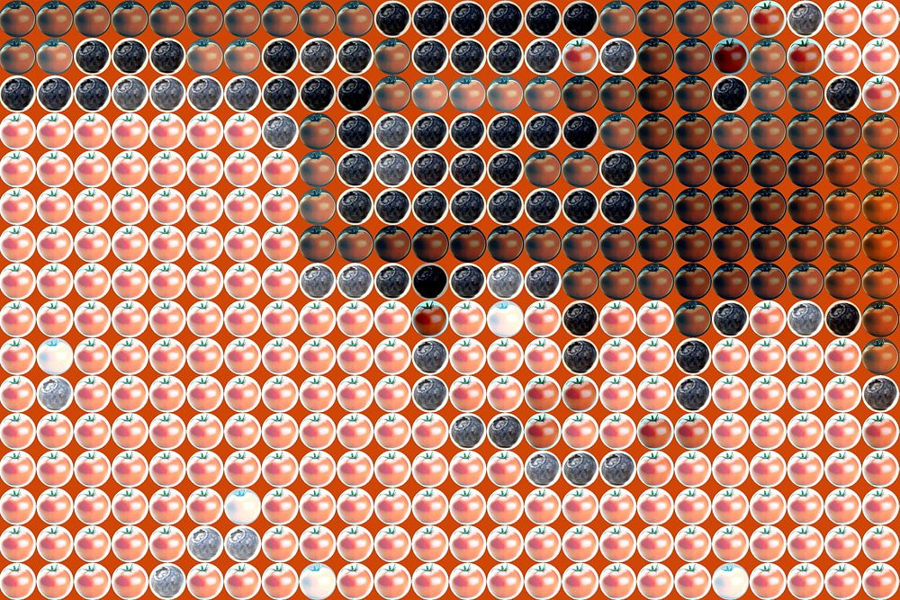 Fotomosaik von Revolver, Beeren und Tomaten.