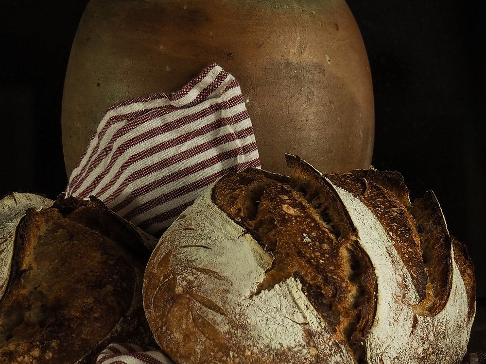 Ein Stilleben von zwei frisch gebackenen französischen Broten auf einem Leinentuch mit einem Brocante-Krug