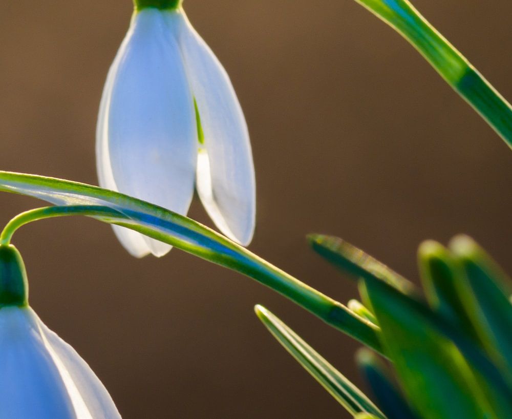 Blumen / Schneeglöckchen / weiß / schneeweiß / Frühling / Blüte / grün / braun / Hintergrund / Dekoration / Gartenarbeit / Februar / Freude / klein / Blütenstand / Stiel / Fokus / selektiv / zerbrechlich / Winter / Jahreszeit / Kunst / Natur / natürlich / Kunst