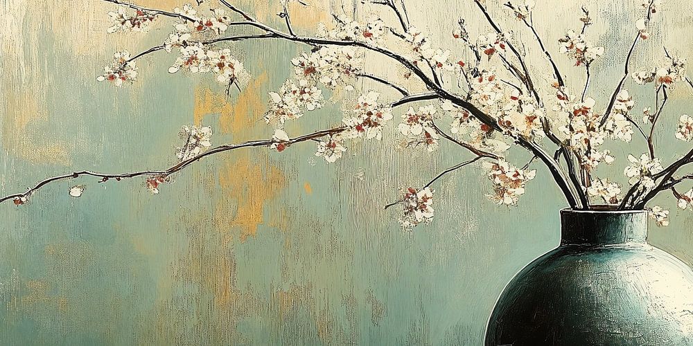 Dieses Kunstwerk zeigt eine ruhige Komposition aus zarten Kirschblütenzweigen, die sich in einer schweren, dunklen Vase ausgelassen vor einem verträumten, verschwommenen Hintergrund winden. Es strahlt eine wohltuende Harmonie zwischen den zerbrechlichen, zarten Blumen und der stabilen Vase aus, eine Ode an die zeitlose Schönheit der Natur.