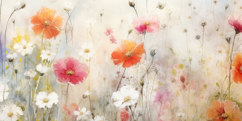 Ein farbenfrohes digitales Gemälde mit verträumten Frühlingsblumen. Das Werk verleiht Ihrem Interieur einen verträumten und klassischen Look!