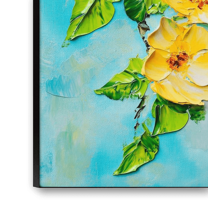 Das Bild entfaltet eine lebendige Komposition mit strahlend gelben Rosenblüten, die sanft auf einem hellblauen Hintergrund strahlen. Die frischgrünen Blätter unterstreichen die lebendige Farbpalette und verleihen der Szene eine fröhliche, verspielte Note. Die floralen Details laden Betrachter ein, die Schönheit der Natur zu genießen und sich von ihrer Eleganz inspirieren zu lassen.