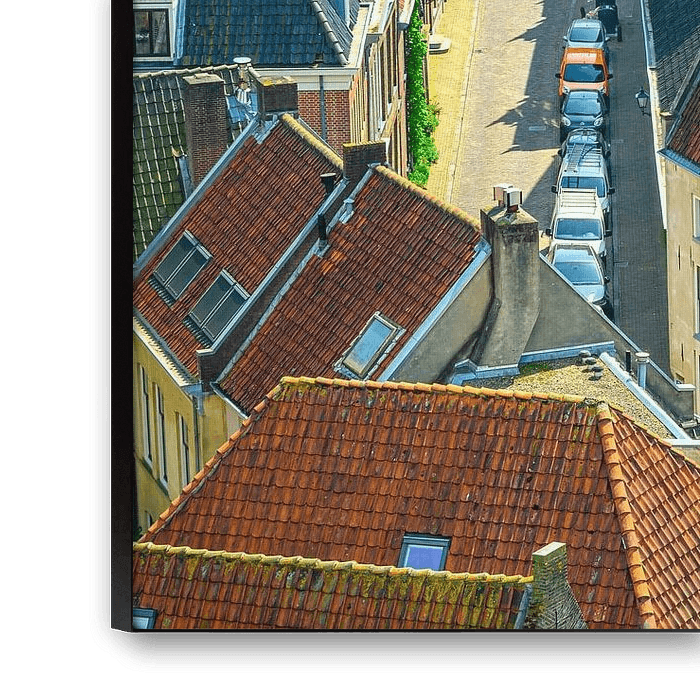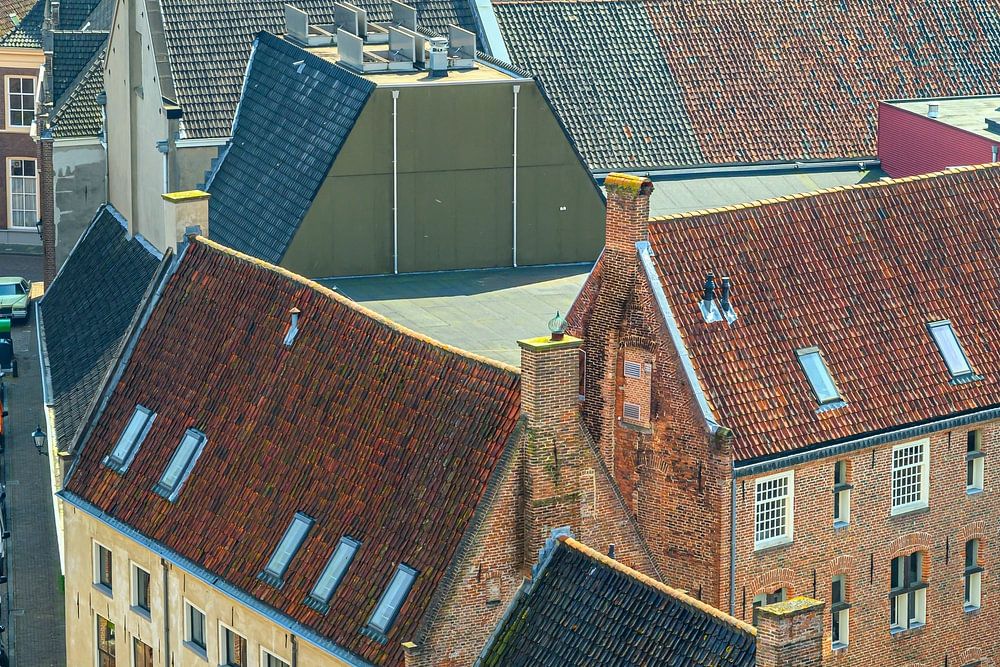 Frühlingshafte Dachansicht von Zwolle mit verschiedenen historischen Gebäuden in der Innenstadt von Zwolle an einem Frühlingstag. Vom Dach der Grote Kerk aus kann man verschiedene historische Häuser und Gebäude sehen.