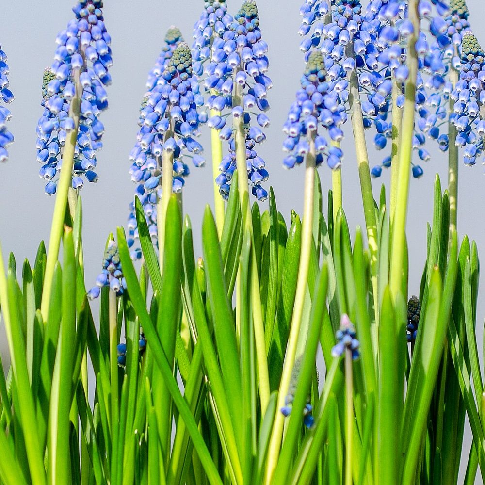 Ein Frühlingsfest mit blauen Weintrauben in einer Schale mit einer glücklichen Biene. Ein frisches und fröhliches Bild.