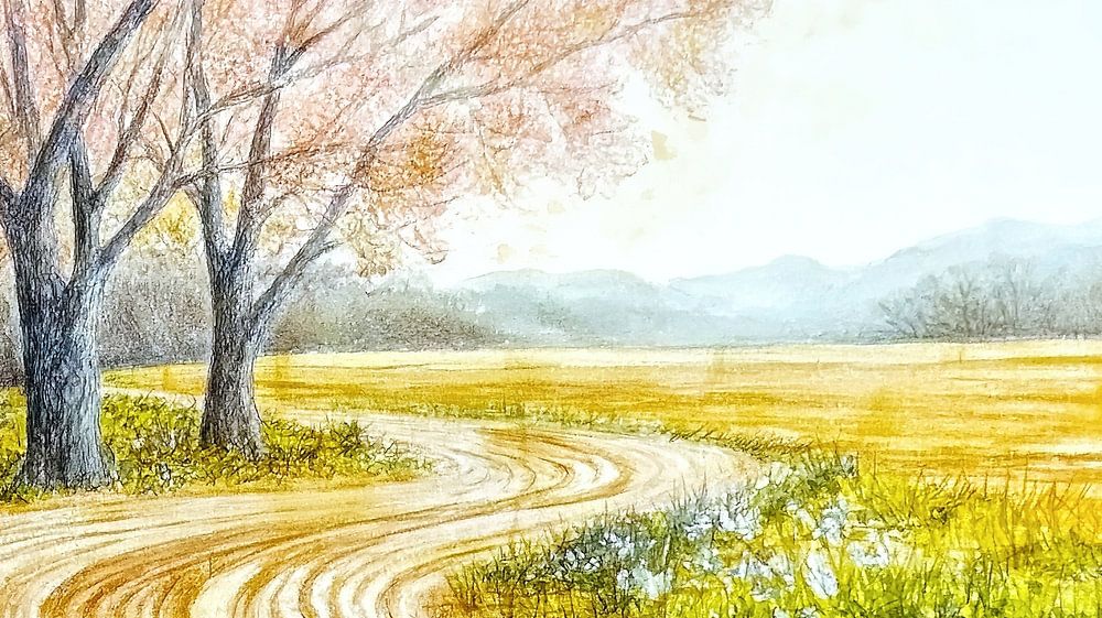 Aquarellgemälde eines kurvigen Feldwegs, der sich durch ein goldenes Feld schlängelt. Auf der linken Seite stehen blühende Bäume, während im Hintergrund ferne Berge unter einem klaren Frühlingshimmel zu sehen sind. Die sanften Farben und detailreiche Gestaltung strahlen Ruhe und die Schönheit der Natur im Frühling aus.