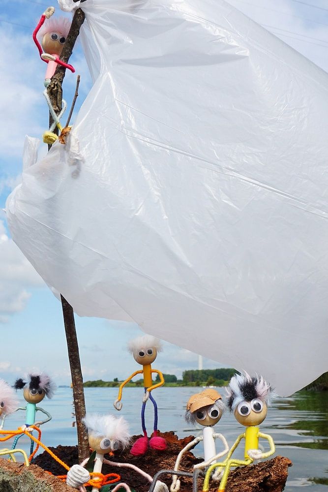 Ein Segelboot aus Baumrinde, das sich mit einer Plastiktüte als Segel vorwärts bewegt. Ein nautischer Touch mit Natur und Umweltverschmutzung als Themen.