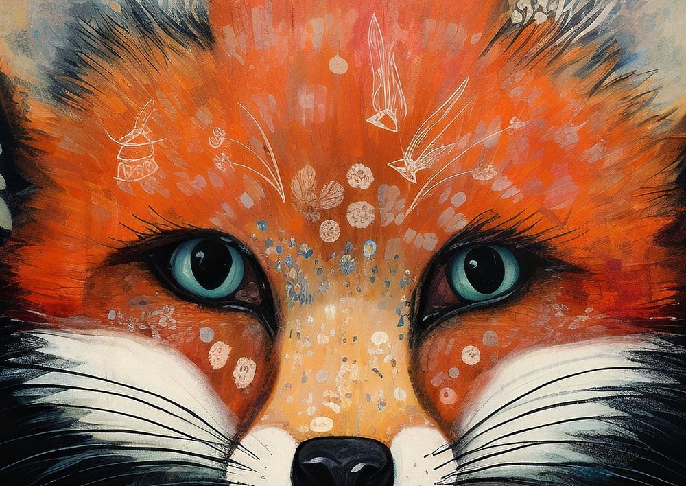 Fuchs Gemälde - Mit einer treffenden Nahaufnahme zieht Sie dieses Gemälde eines Fuchses direkt in die Natur. Die Darstellung ist lebendig mit seinem warmen orangefarbenen Fell und seinem intelligenten Blick inmitten eines ruhigen Blumenmeeres auf dunklem Hintergrund. Die Mischung aus Realismus und dekorativem Stil verleiht dem Gemälde einen zeitgemäßen und doch zeitlosen Charakter, der sich perfekt als warme Ergänzung für jedes Interieur eignet.