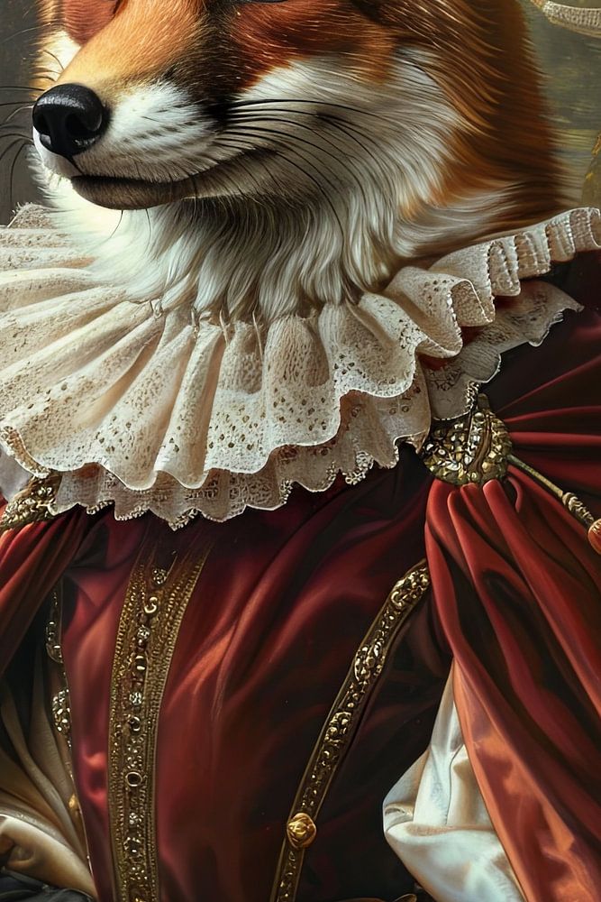 Dieses kunstvolle Portrait zeigt einen eleganten Fuchs in prachtvoller barocker Kleidung, verziert mit aufwendigen Rüschen und edlen Accessoires. Die Detailtreue der Pelzdarstellung und die kunstvoll gearbeiteten Stoffe verleihen dem Bild eine humorvolle und zugleich beeindruckende Note. Ein ideales Kunstwerk für Liebhaber von außergewöhnlichen Tierportraits und kreativen Barock-Darstellungen, das in jedem Raum ein Blickfang ist und ein Lächeln auf die Gesichter der Betrachter zaubert.