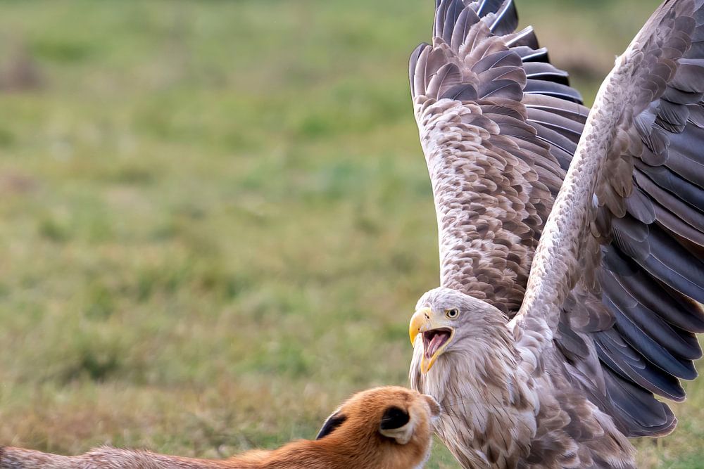 Der Fuchs ist über den Lärm der Seeadler hergefallen und versucht, der Beute des Seeadlers zu entkommen. Trotz der Tatsache, dass der Fuchs viel kleiner ist als der Seeadler, schafft er es, mit dem Essen davonzukommen. Der Fuchs ist gerissen und mutig.