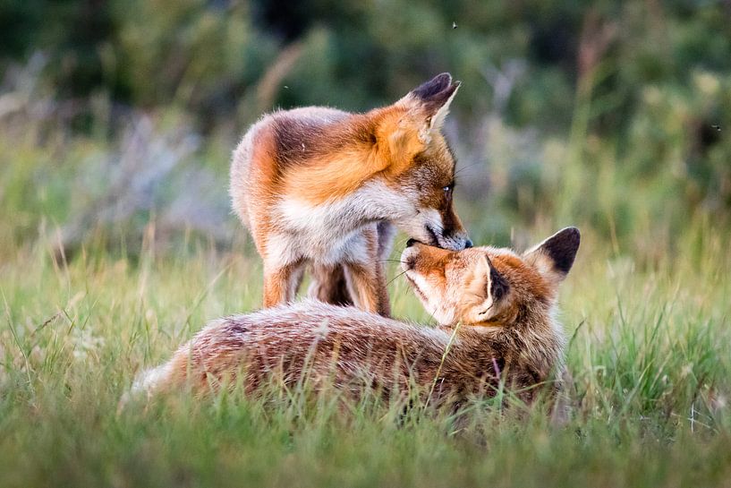 Zwei Rotfüchse treffen sich im Sommer bei tief stehender Abendsonne in den Amsterdamer Wasserversorgungsdünen.