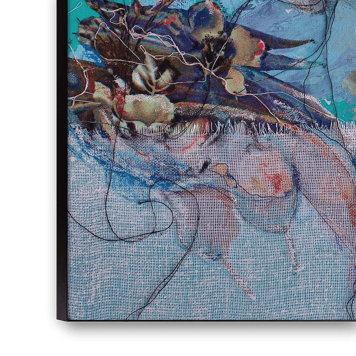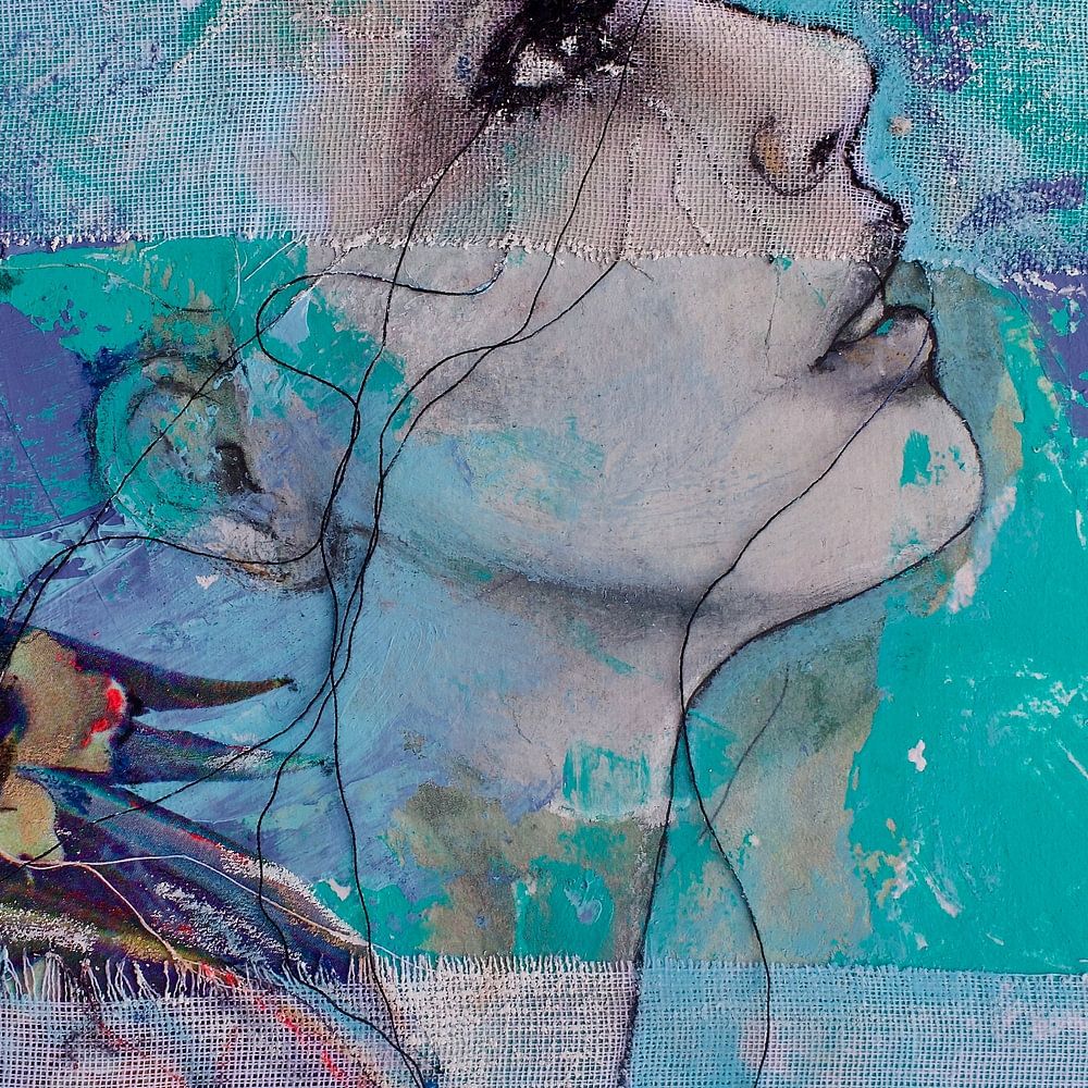 Die losen Fäden 'fallen' von der Leinwand & geben dem Werk ein Gefühl von Bewegung & Freiheit. Manchmal kombiniert Kim unter anderem mit Keramik, Kohle und Farbe, um verschiedene Materialien spielerisch zu einem Ganzen zusammenzufügen.
