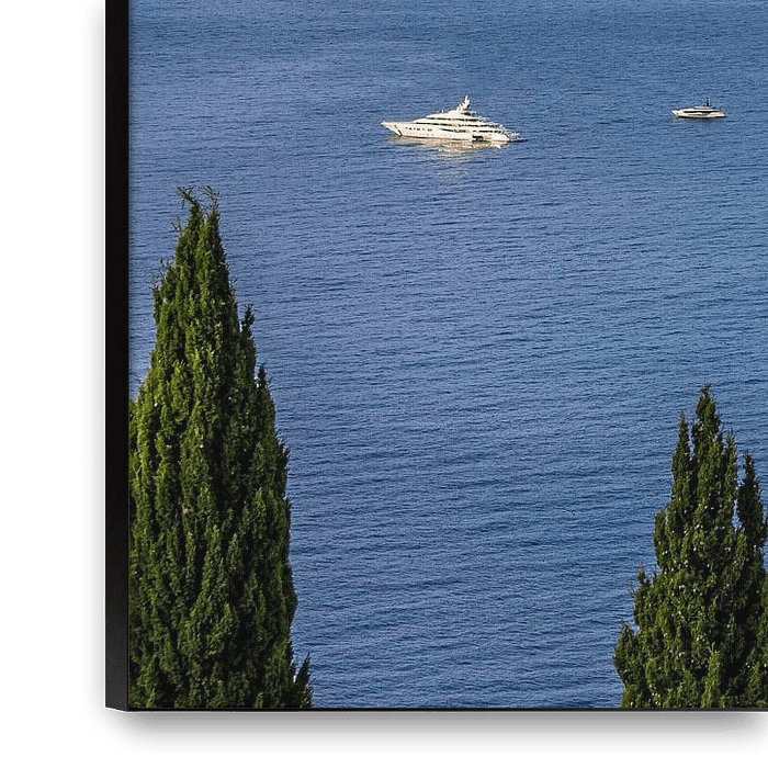 FOTOGRAFIE Blick von Roquebrune auf eine große Motorjacht auf dem Mittelmeer vor Monaco und das Fürstentum Monaco, Roquebrune-Cap-Martin, Frankreich